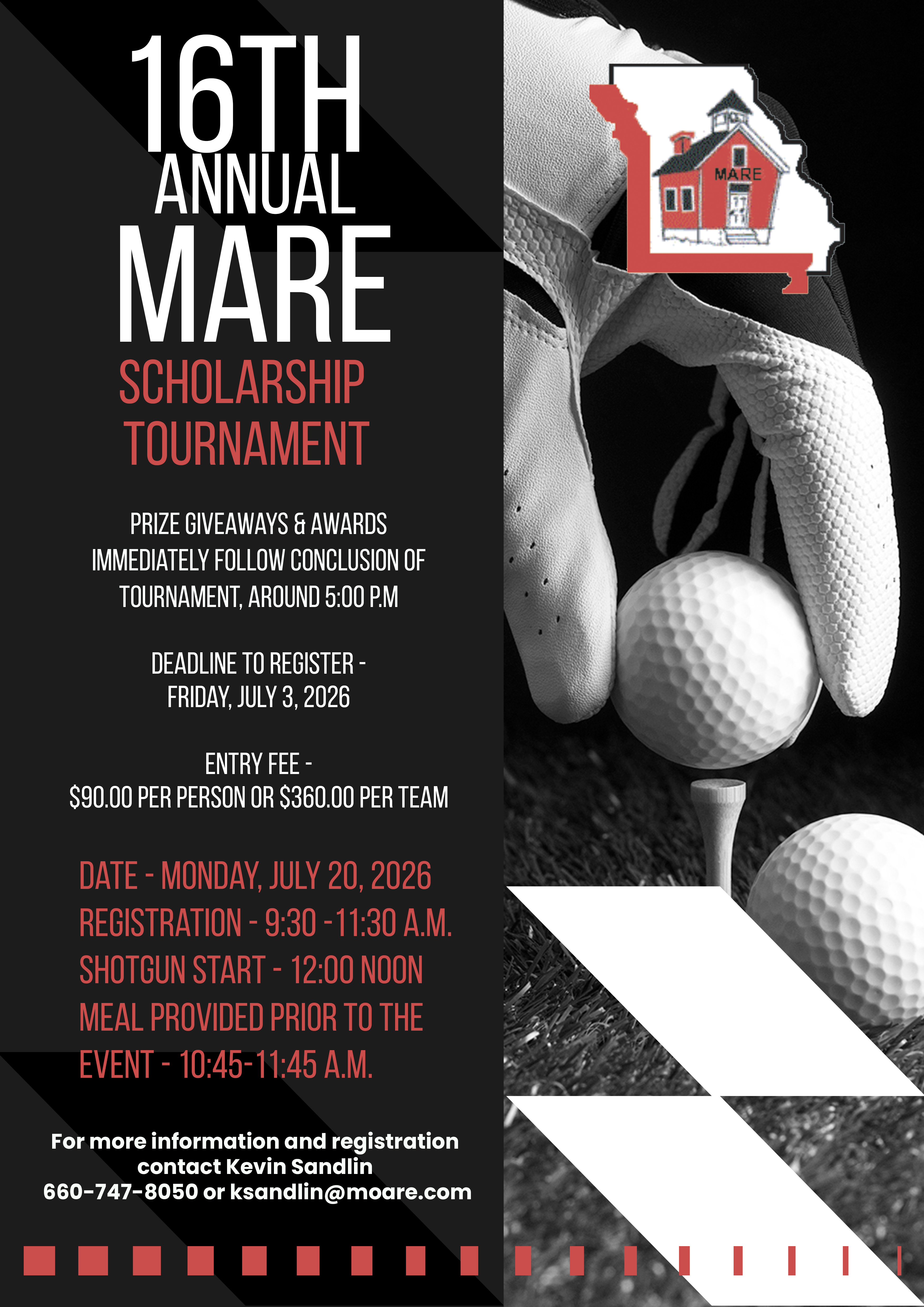 Registration is now open and we will accept the first thirty-six (36) paid teams and commit slots to them. Our format is the same as last year, with registration slated from 9:30-11:45 a.m., lunch from 10:45-11:45 a.m. and a shotgun start of 12:00 noon. Flight winners and the prize giveaway will immediately follow the event at approximately 5:00 p.m. Please access the appropriate forms below to complete and send in to secure your slot. If you cannot support this as a Corporate Sponsor, Team Sponsor or Hole Sponsor but would like to help out, please consider donating gift cards or golf related items (hats, golf balls, tees, gloves, clubs, etc.) so that we can hold down our costs and award more in scholarship prizes. For more information, please contact Kevin Sandlin at (660) 747-8050 or by email at ksandlin@moare.com.