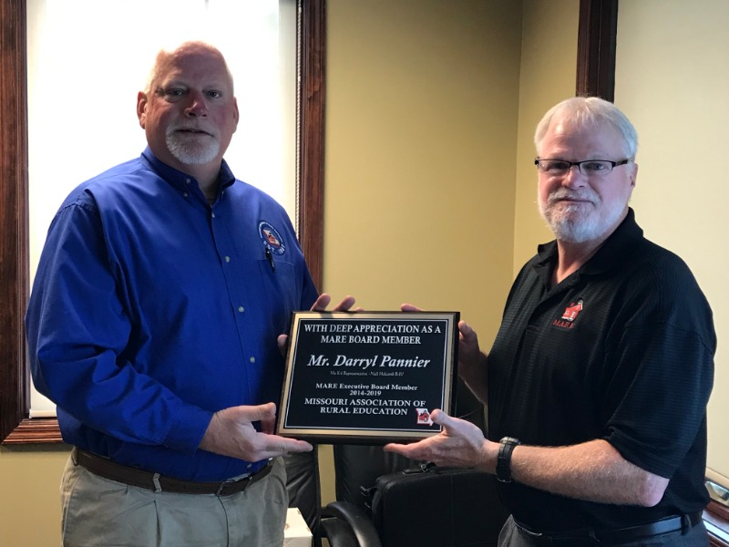 The Missouri Association of Rural Education recognized two retiring Executive Board members at their meeting on Monday, May 6th in Jefferson City. Mr. Darryl Pannier, Superintendent at Nell-Holcomb R-IV, and Dr. Tim Boatwright, Superintendent at Halfway R-III, both are set to retire at the end of this current school year. Darryl has served on the MARE Executive Board as the Missouri K-8 Association Representative for the past five years. He served as Board President for the past two years. Tim has served as the Region A Representative for the past nine years. He served as Board President in 2015-2016 and 2016-2017. The organization truly appreciates the loyal and dedicated service of these two individuals. We wish them both the very best as they move into retirement from public education!